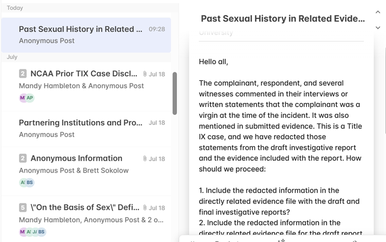 Questions are asked directly to the Listserv by active ATIXA members for all members to view, respond, share resources. An anonymous portal is also provided for anonymity in asking questions or responding to any thread.